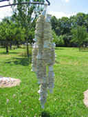 La colline de Sion est bien un lieu où souffle l'esprit, l'esprit créatif ces journées-là, un lieu choisi par l'association Al Terre Native, organisatrice, avec l'aide du conseil général de Meurthe-et-Moselle, de ces "Chemins de la céramique" qui attirent chaque année en juillet artistes consacrés, artistes en herbe et public averti. Au retour, nous nous sommes arrêtés au pied du monument dédié à Maurice Barrès (1863-1923), lieu dominant lui aussi le saintois, d'où s'élancent par beau temps et bon vent de nombreux parapentistes. Un peu plus loin encore, à flanc de colline, à croupetons, nous avons gratté patiemment quelques décimètres carrés d'une butte de terre calcaire pour tenter d'en extraire quelques minuscules crinoïdes, les fameuses "étoiles", qui font partie de la légende attribuée à Notre Dame de Sion. Crinoïdes qui sont en fait des restes fossilisés d'animaux qui vivaient dans la région à la période du Jurassique lorsque la région était recouverte d'une mer chaude.